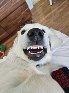Saint, our golden retriever puppy, smiling with healthy teeth in 2026.