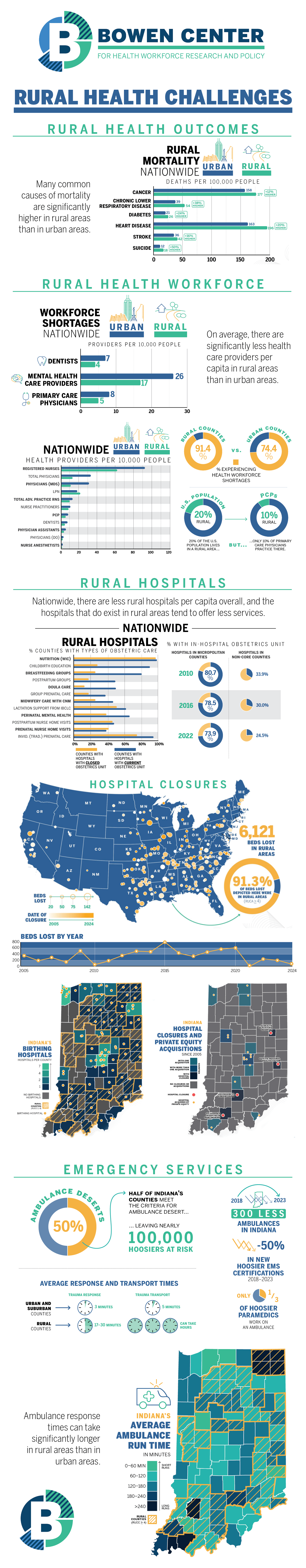 - EMS: Emergency Medical Services also pose a critical challenge to rural communities in Indiana and across the country, with significantly slower response times in most rural areas for emergency services. See more details about tackling this critical health workforce shortage on our dedicated EMS project page or by downloading our 2023 report on this topic here.OTHER BOWEN RESOURCES RELATED TO RURAL HEALTH: Almost all of our health workforce data and reports touch on rural health communities in one way or another, but these two resources are particularly focused on challenges related to rural communities: PLAYBOOK: Mental and behavioral health challenges are particularly acute in rural communities in Indiana and nationwide. Bowen has developed a detailed plan to tackle Indiana’s mental health crisis, called the Playbook for Enhancing Indiana’s Mental and Behavioral Health Workforce. Check out the Playbook project home page here. EMS: Emergency Medical Services also pose a critical challenge to rural communities in Indiana and across the country, with significantly slower response times in most rural areas for emergency services. See more details about tackling this critical health workforce shortage on our dedicated EMS project page or by downloading our 2023 report on this topic here.